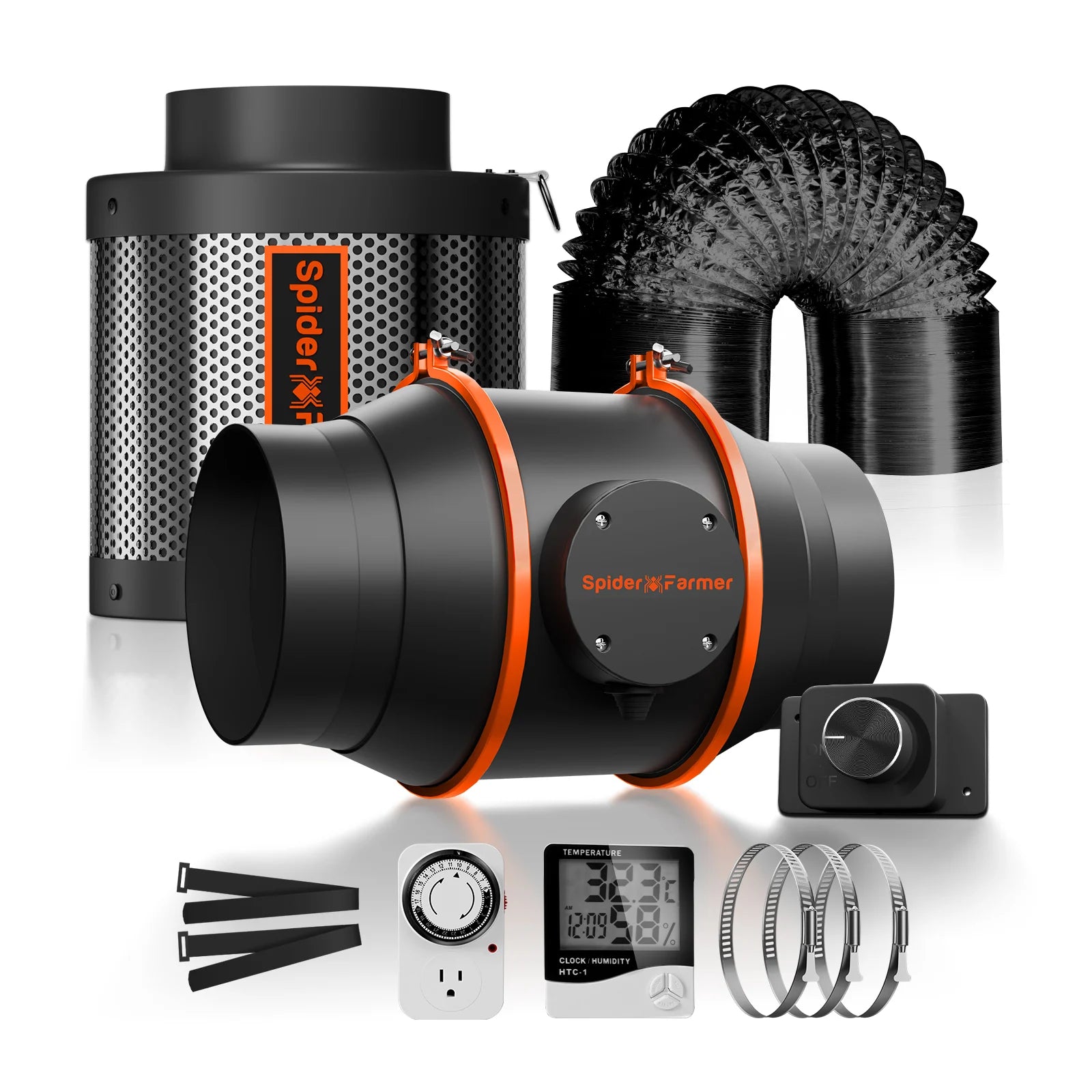 Pakkaus sisältää: 1 x 6" linjatuuletin, 1 x 6" hiilisuodatin, 1 x nopeudensäädin, 1 x kanava, 1 x ajastin, 1 x lämpö-kosteusmittari, muut lisävarusteet (GGS-säädin ei sisälly).